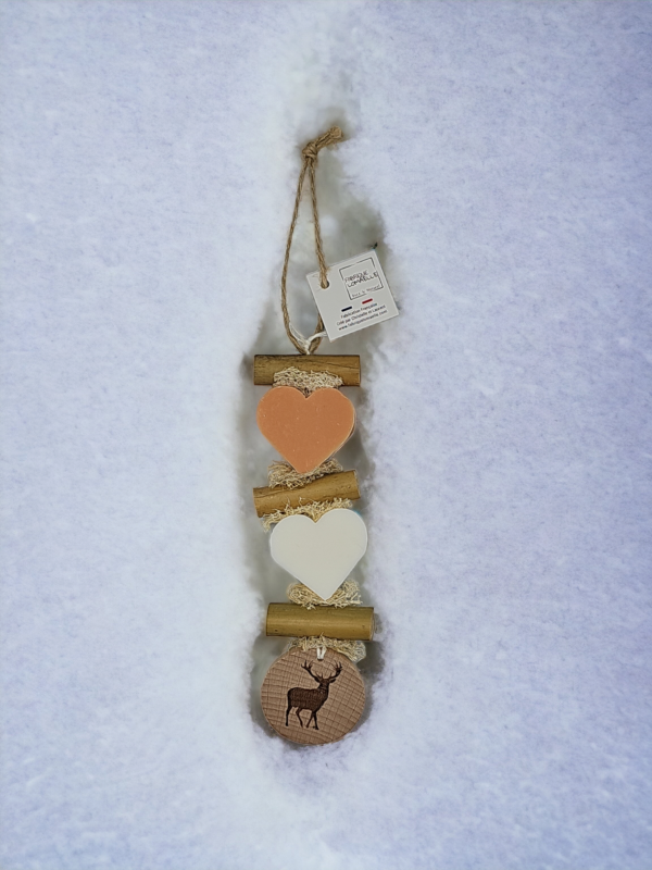 Tresse 1 savon cœur fleur d’oranger 1 cœur bergamote avec médaillon en bois cerf debout