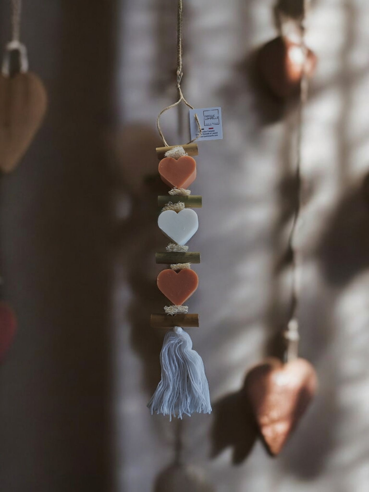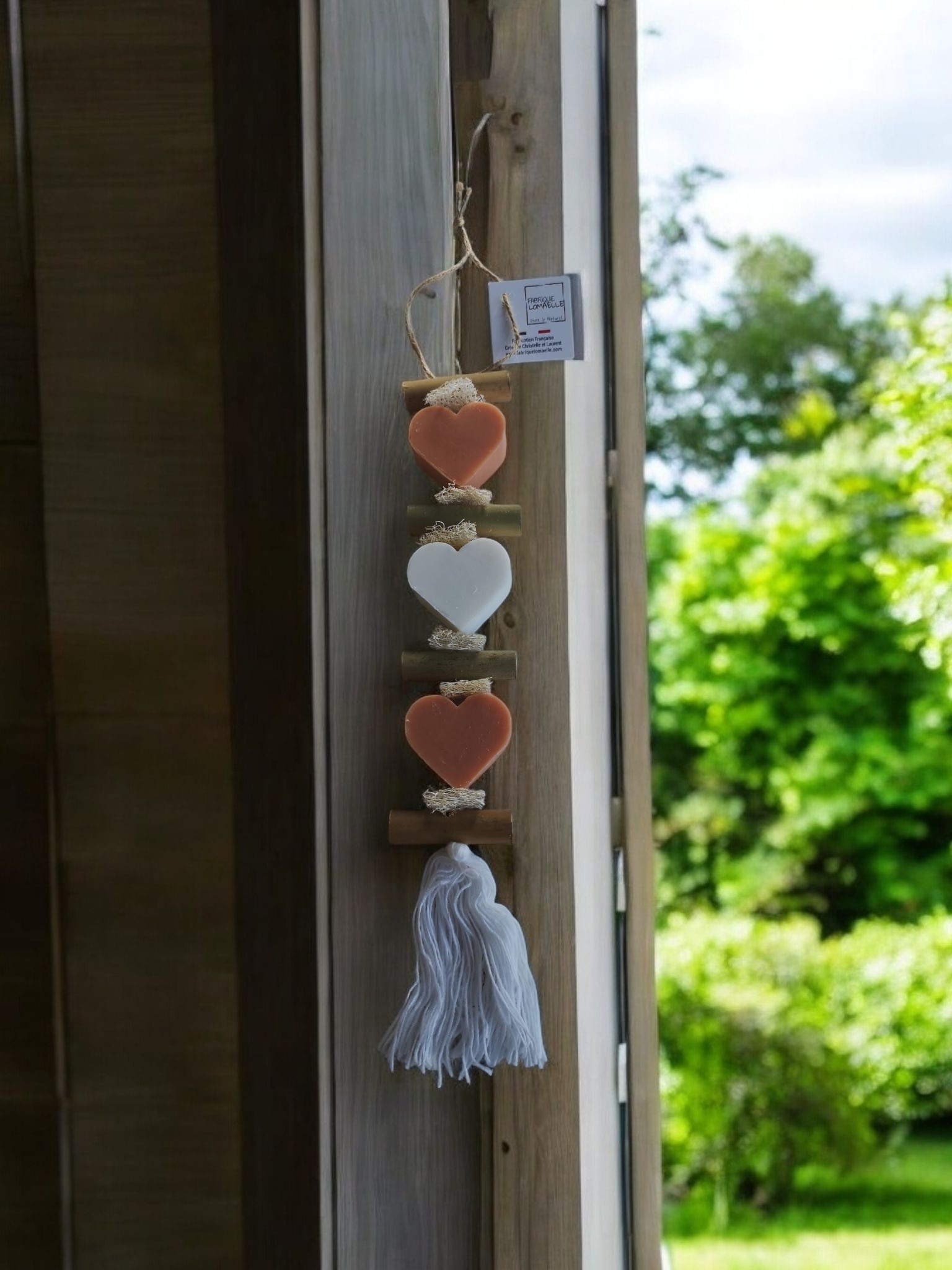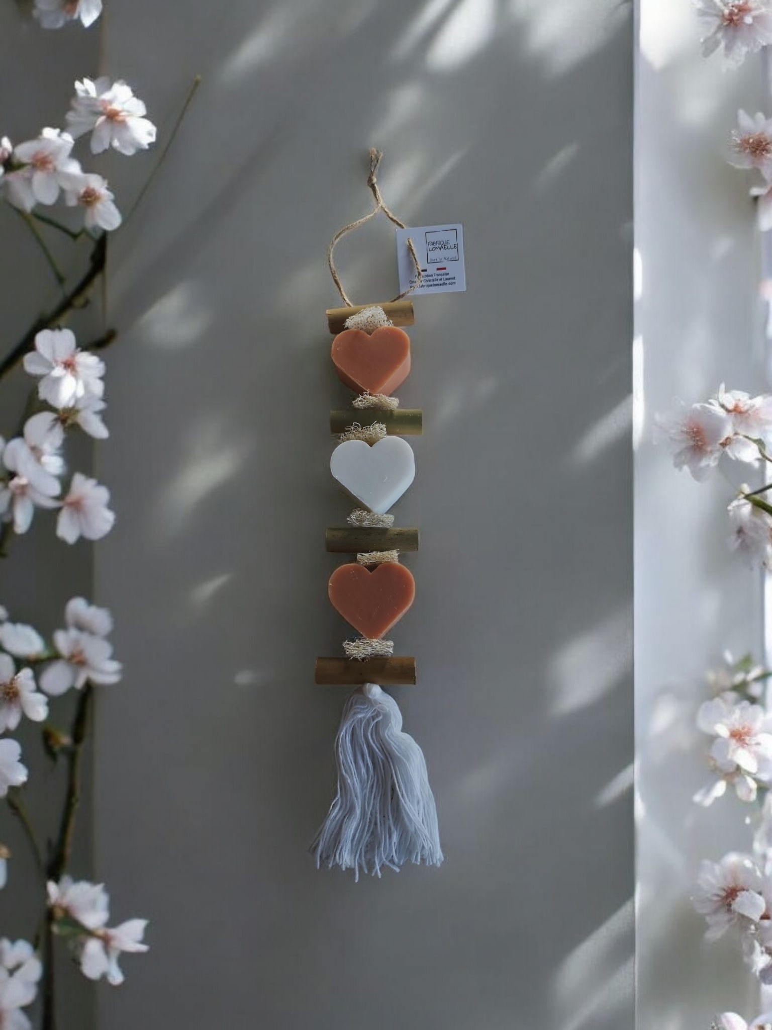 Tresse de savons colorés et parfumés fleur d’oranger et bergamote à suspendre.